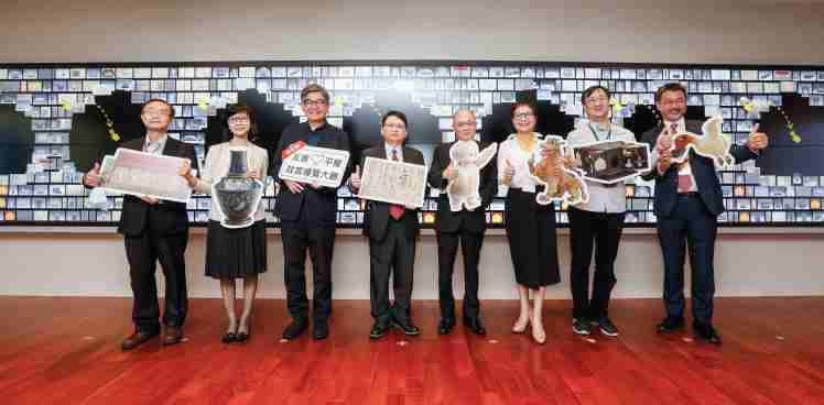 z6尊龙携手创利空间为故宫建置的智慧文物互动导览墙及轮播墙,,,,今日正式启用。。。。(左四:z6尊龙新事业暨投资管理总部副总经理杨本豫、、右四:故宫博物院院长吴密察、、、、右三:太极影音董事长黄宝云)